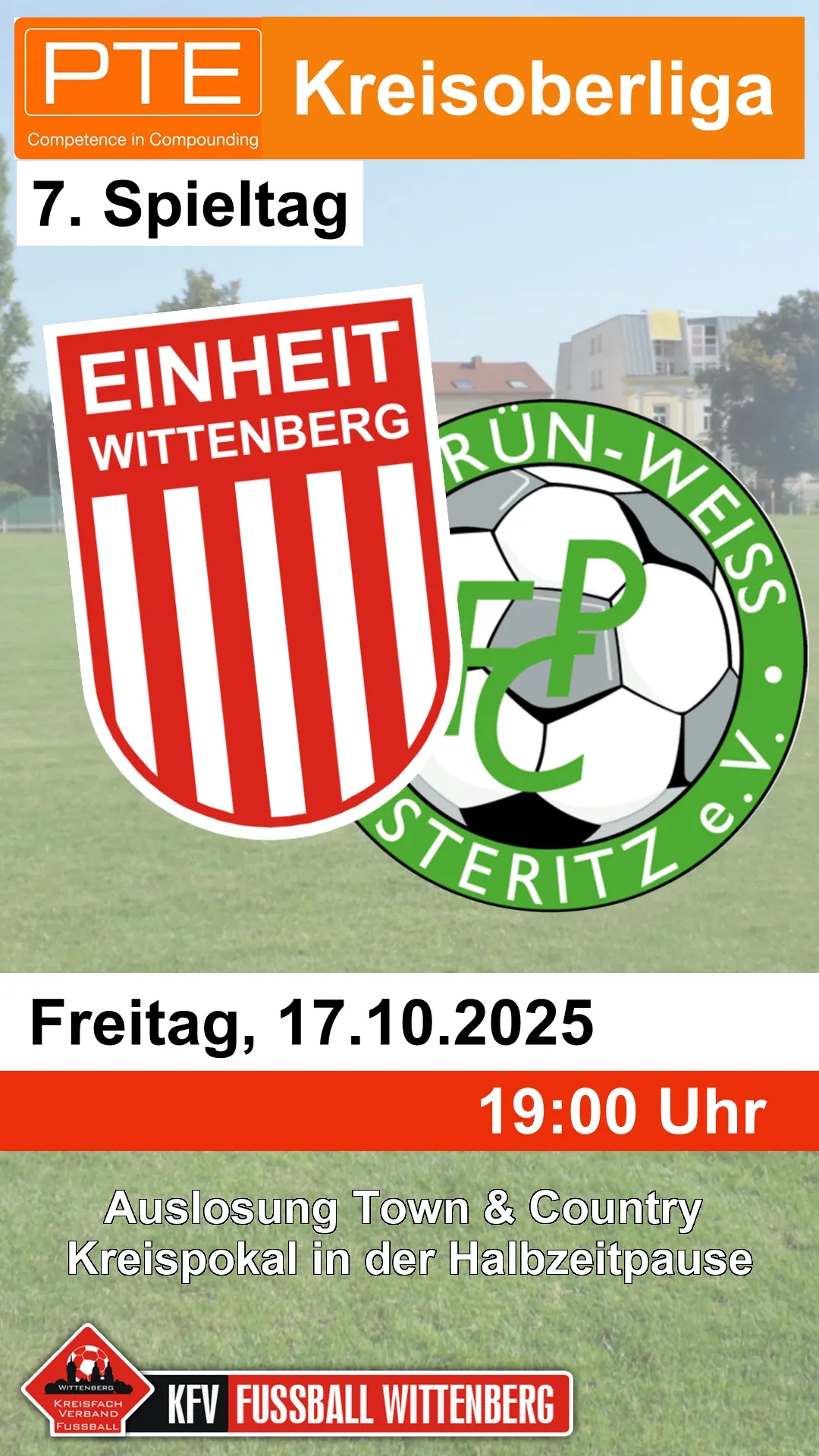 Der 7. Spieltag der PTE Kreisoberliga Wittenberg wird am kommenden Freitagabend mit dem Stadtderby zwischen dem SV Einheit Wittenberg und der Landesligareserve des FC Grün-Weiß Piesteritz auf dem Platz der Jugend eröffnet.