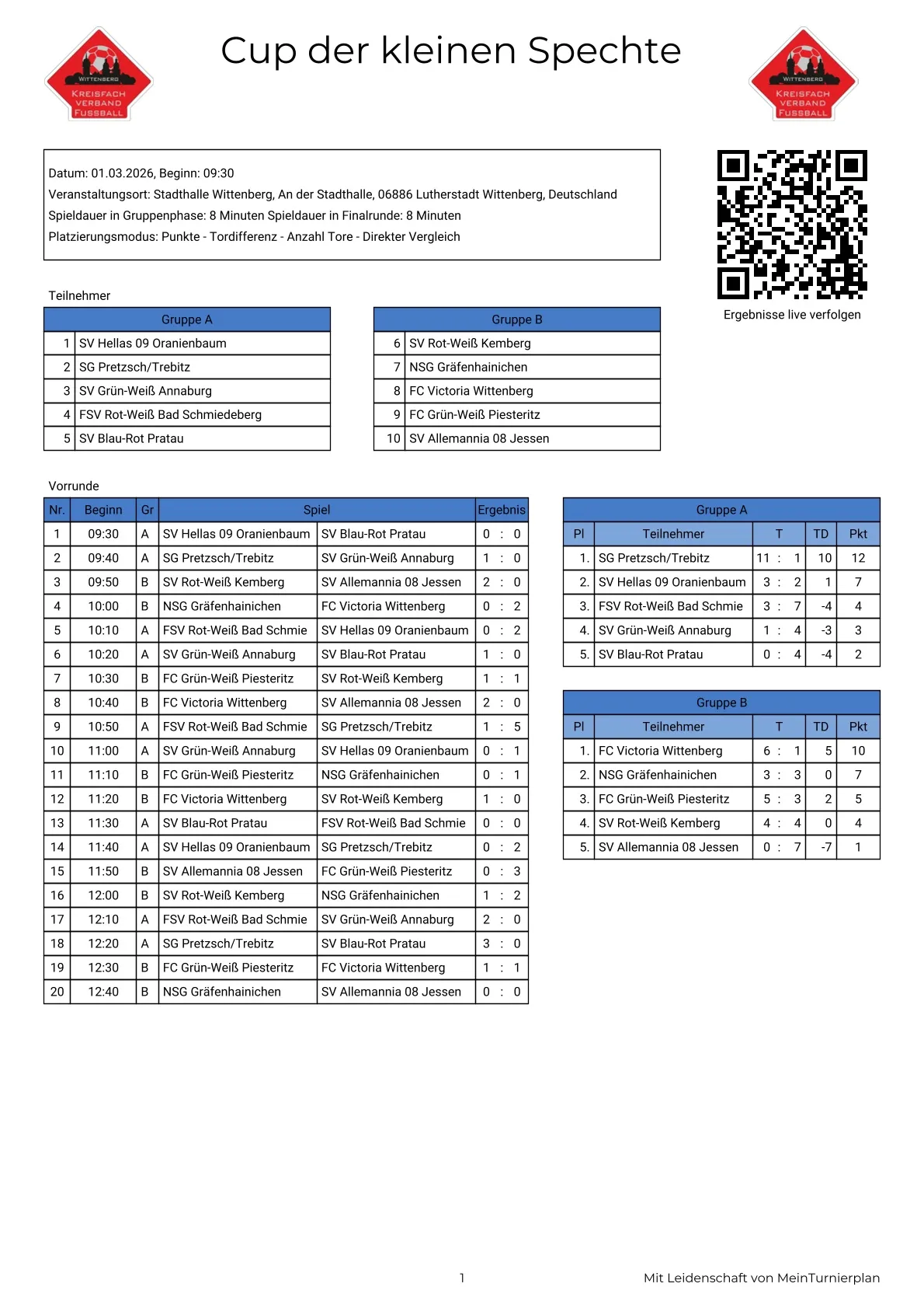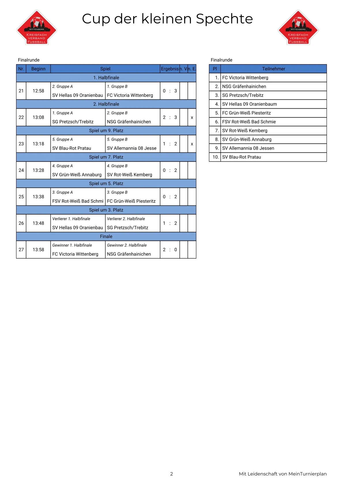 Das Turnier wurde in zwei Gruppen a 5 Mannschaften gespielt. Am Ende setzten sich in der Gruppe A der SV Hellas 09 Oranienbaum sowie die SG Pretzsch/Trebitz durch und zogen ins Halbfinale ein.
